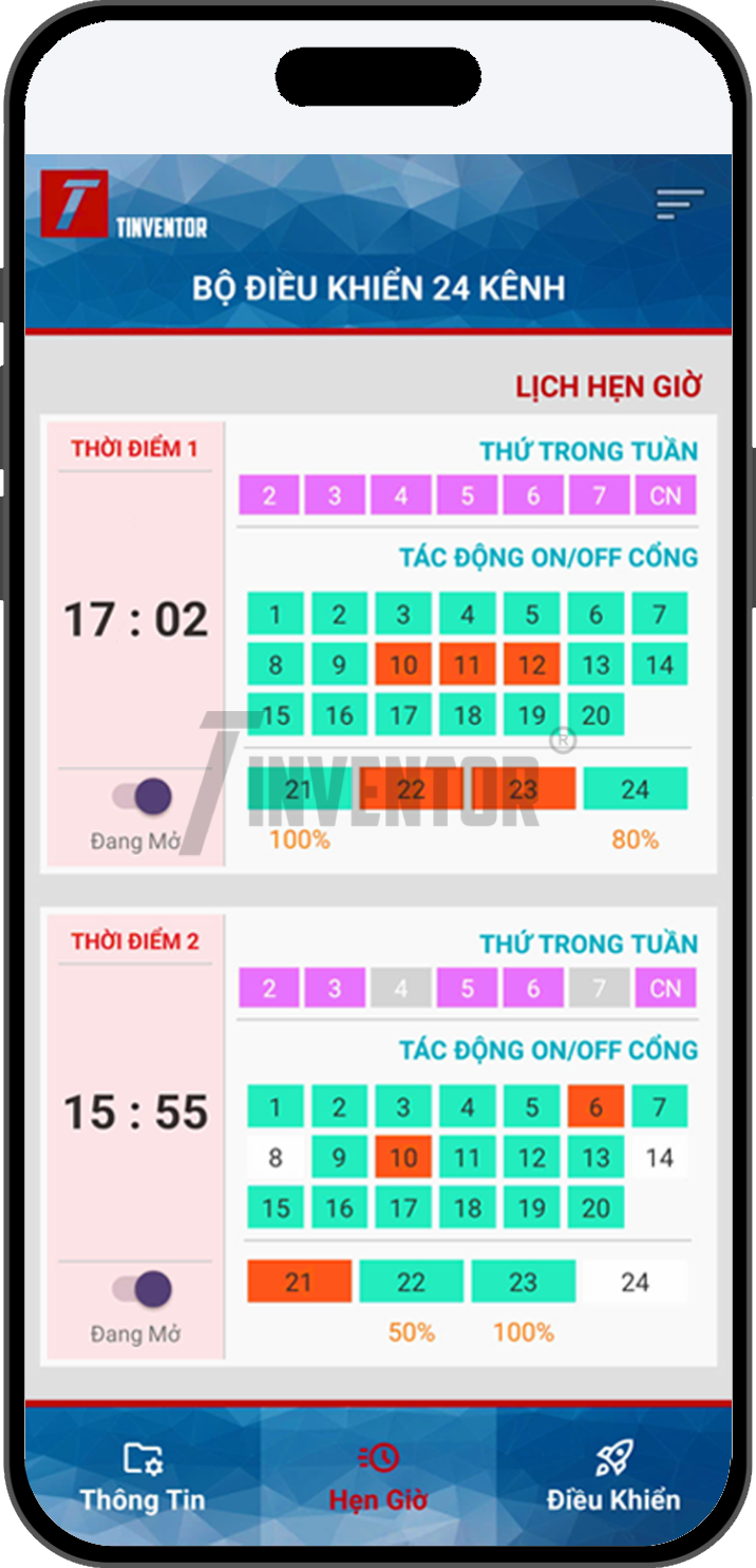 Bộ hẹn giờ Việt Nam BDK-DC240UT dùng điều khiển 24 ngõ ra DC, trong đó 20 kênh On/Off và 4 kênh điều tốc động cơ DC. Bo mạch sử dụng MOSFET công suất lớn, cho độ bền cao, phản hồi nhanh, không gây tiếng ồn. Dòng tải tới 3A/kênh. Cài đặt 20 thời điểm hẹn giờ/ngày, riêng biệt 7 ngày/tuần. Cung cấp App điều khiển trên điện thoại, điều khiển toàn cầu. Hỗ trợ 3 chế độ hoạt động Online/ Offline/ Direct.