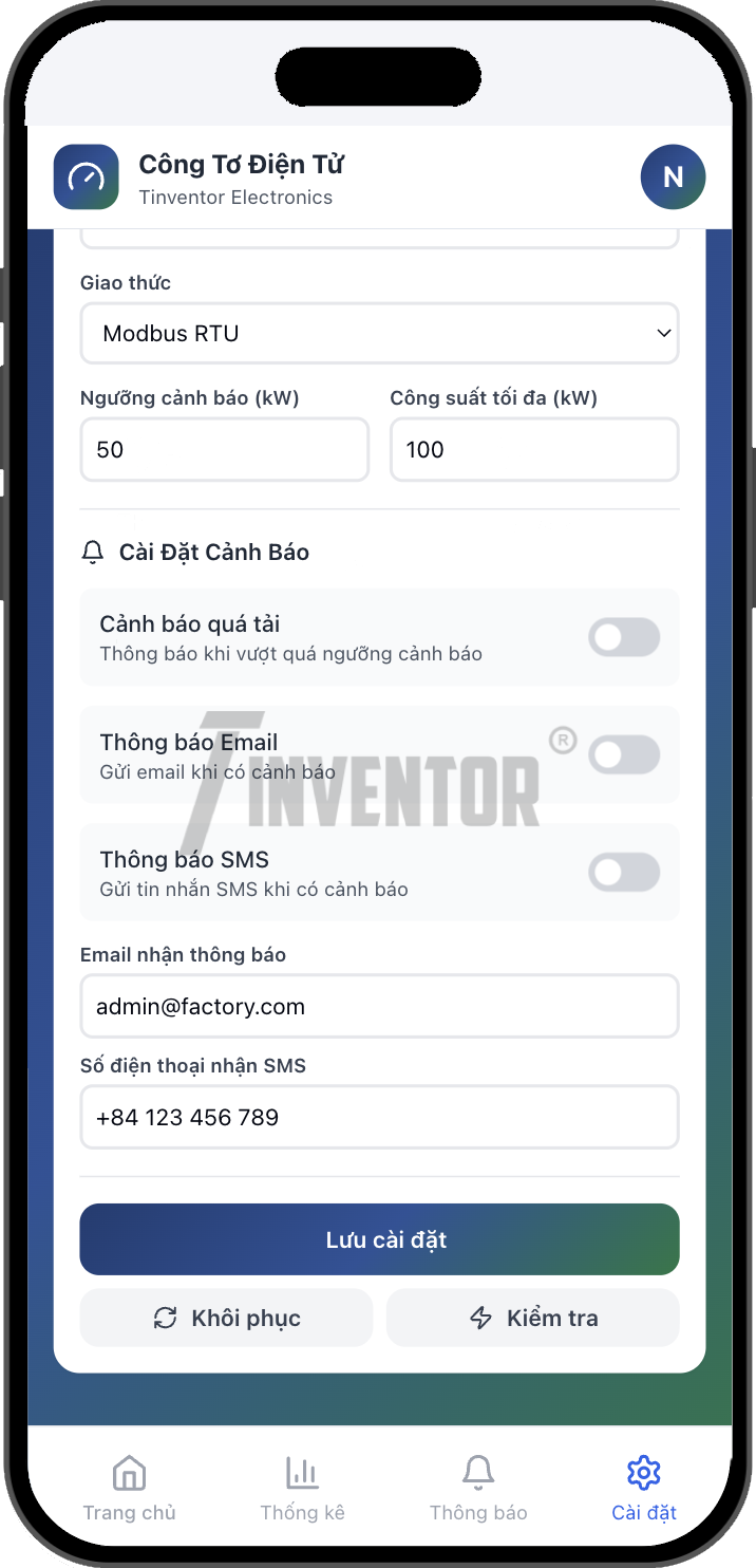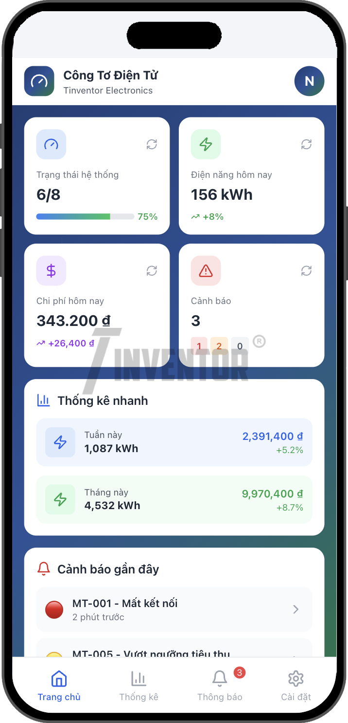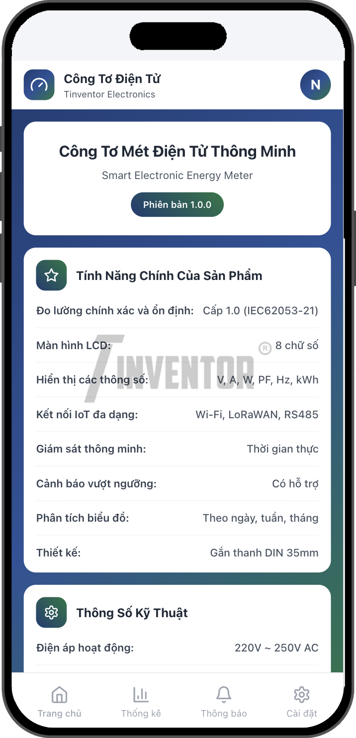 Đi kèm với thiết bị là một hệ sinh thái phần mềm hoàn chỉnh, bao gồm Ứng dụng di động (hỗ trợ song ngữ Anh/Việt) và Website quản lý hiện đại, giúp việc giám sát và vận hành hệ thống nhiều công tơ trở nên đơn giản và hiệu quả.